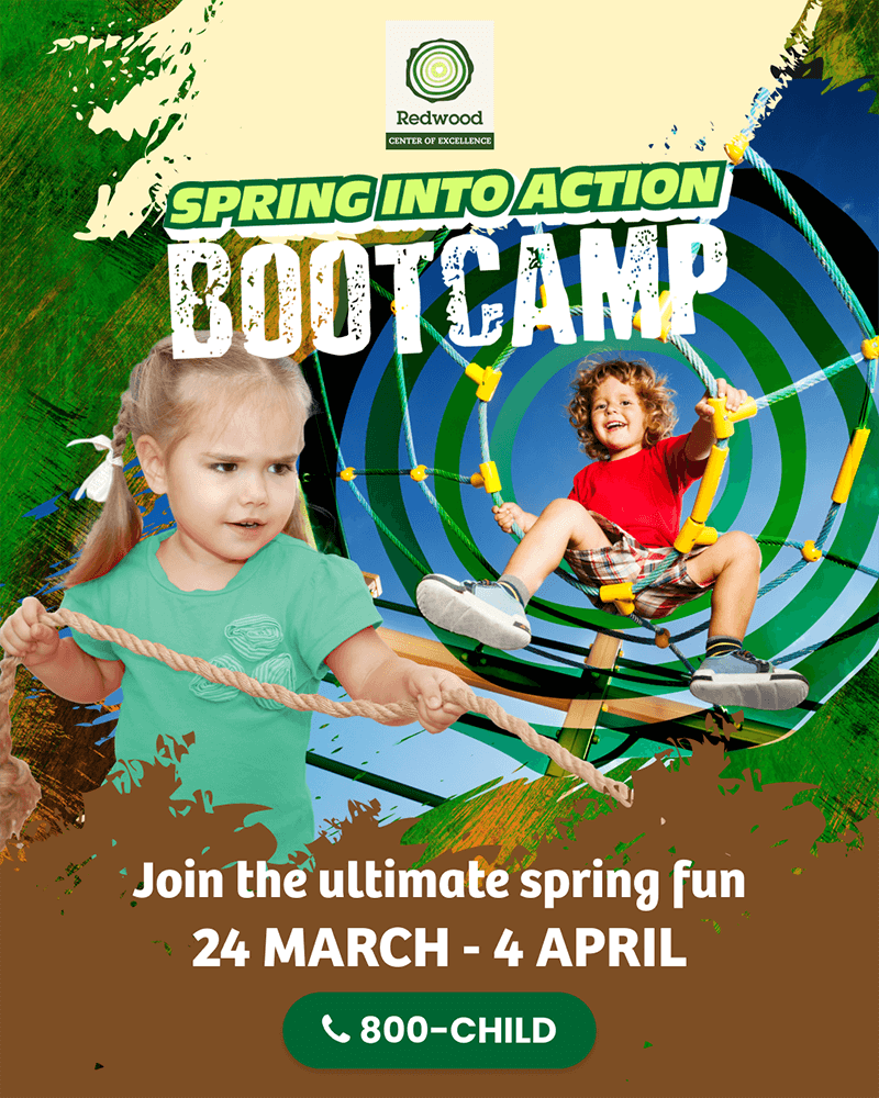 • Date: Mon, Mar 24, 2025 – Fri, Apr 4, 2025 ( Add to Calendar 03/24/2025 04/04/2025 "Spring into Action Bootcamp" - Redwood Center of Excellence A Spring-into-Action Bootcamp, your child will jump, climb, and play their way through an action-packed camp! With obstacle courses, soccer, mini track & field, and dance sessions, this is the ultimate camp for energetic little ones.